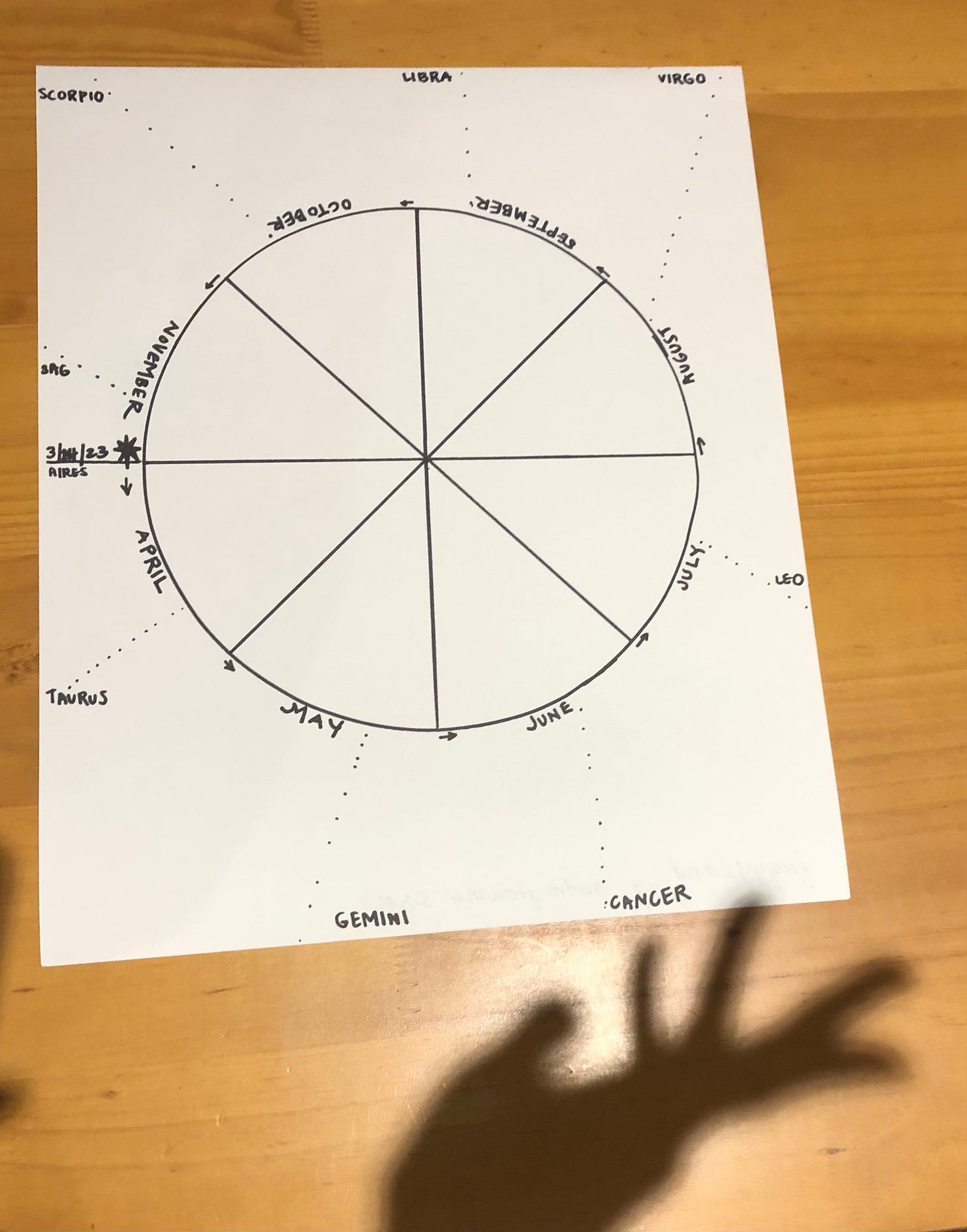 [description] shadow hand emphasizes paper with a large circle in the middle divided into 8ths. the slices are labled as months April - November starting at the far left going down. on the outside of the circle, dotted lines divide roughly the different astrological months by sun sign Aries - Sagittarius' start. (wheel may be adjusted to reflect all 12 months/seasons if you prefer). seeing the month names reminds me of the planting seasons, the social shifts by month, different markers of societal time that associate with months. seeing the astrological season names brings forth dispositions, attitudes, and energies associated with each archetype and memories of how i feel affected by them. seeing them juxtaposed helps me to balance the flow of planning from many angles.